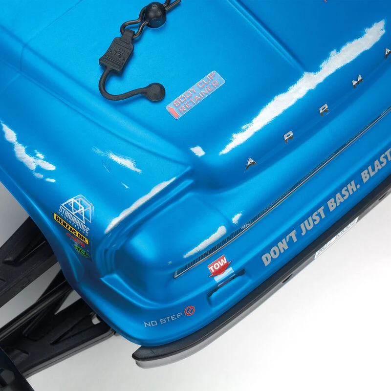 For the toughness needed to support extreme stunts, ARRMA® uses a strengthened anodized aluminum chassis as the foundation. A center body support and aluminum center brace plus composite chassis side pods add more durability. All-metal diff outdrives and gearbox internals plus durable steel driveshafts provide a reliable, heavy-duty drivetrain that holds up to extreme stunts and high-speed bashing. A “never loose” aluminum steering servo saver and “never pop” ball ends supply more precision, reliability and confidence.