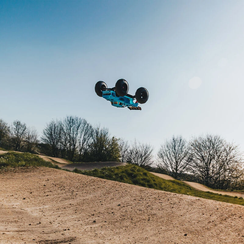 With adjustable 16mm oil-filled shocks on aluminum towers soaking up bumps, the NOTORIOUS™ 6S BLX 4WD Stunt Truck blasts over dirt, asphalt, and grass — over all terrain, in all conditions. Its tough stunt truck wheels come outfitted with multi-terrain dBoots® BACKFLIP™ tires that provide all the traction you’ll need to flip, grip, wheelie and spin. A high downforce wing helps keep the vehicle grounded. Everything about the NOTORIOUS™ 6S BLX 4WD contributes to confident control and responsive handling at thrilling high speeds.