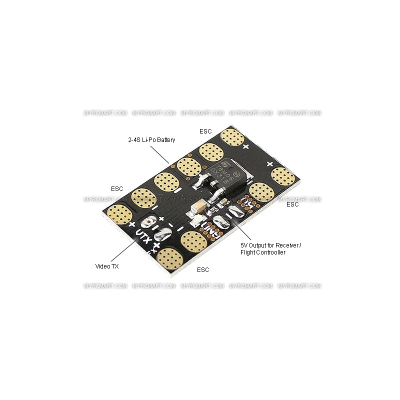 This Mini Power Distribution Board is designed for micro multirotor copters between 120-160mm frame that the maximum current will not excess 50A. You can simply use Double Sided Tape (with thin soft foam) to stick this board on the frame.