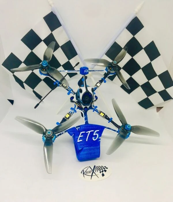 With the release of the HQ T5x3x2 lightweight t-mount props and the need of a true lightweight 5? frame in the industry, Racer X FPV continues to innovate and has designed the ET5 “Extraterrestrial TWIG 5”. The ET5 is a mutated TWIG frame that can accommodate 5? props. The frame is premium 3.5mm thick high grade T700 carbon cut along the weave and chamfered on both sides interior and exterior edges at .8mm. The frame measures approximately 200mm from motor post to motor post. Motor mounting is for 4-hole 9×9 or 12×12 motor mounts. You do not have to use t-mount motors as there are also a lot of 5mm shaft motors from 15xx to 16xx that are great choices as well as lots of 5mm 5? shaft props to choose from on the market. We highly recommend keeping your motors under 18 grams since this is a lightweight frame. With our strong signature cross bar design, we were able to design a super lightweight 5? frame at only 3.5mm, yet super durable and stiff to allow it to track like all our amazing frames do. The ET5 can accommodate a standard 20×20 stack or a whoop toothpick aio.